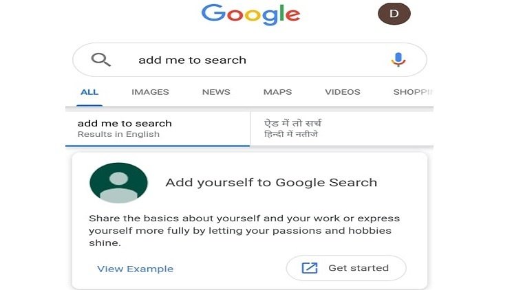 - अब इस गूगल ऐप्प के सर्च बॉक्स में add me to search लिखे। आपको गूगल पर सबसे पहली लिंक पर Add yourself to Google Search दिखेगा, अब आप Get Started पर क्लिक करे।